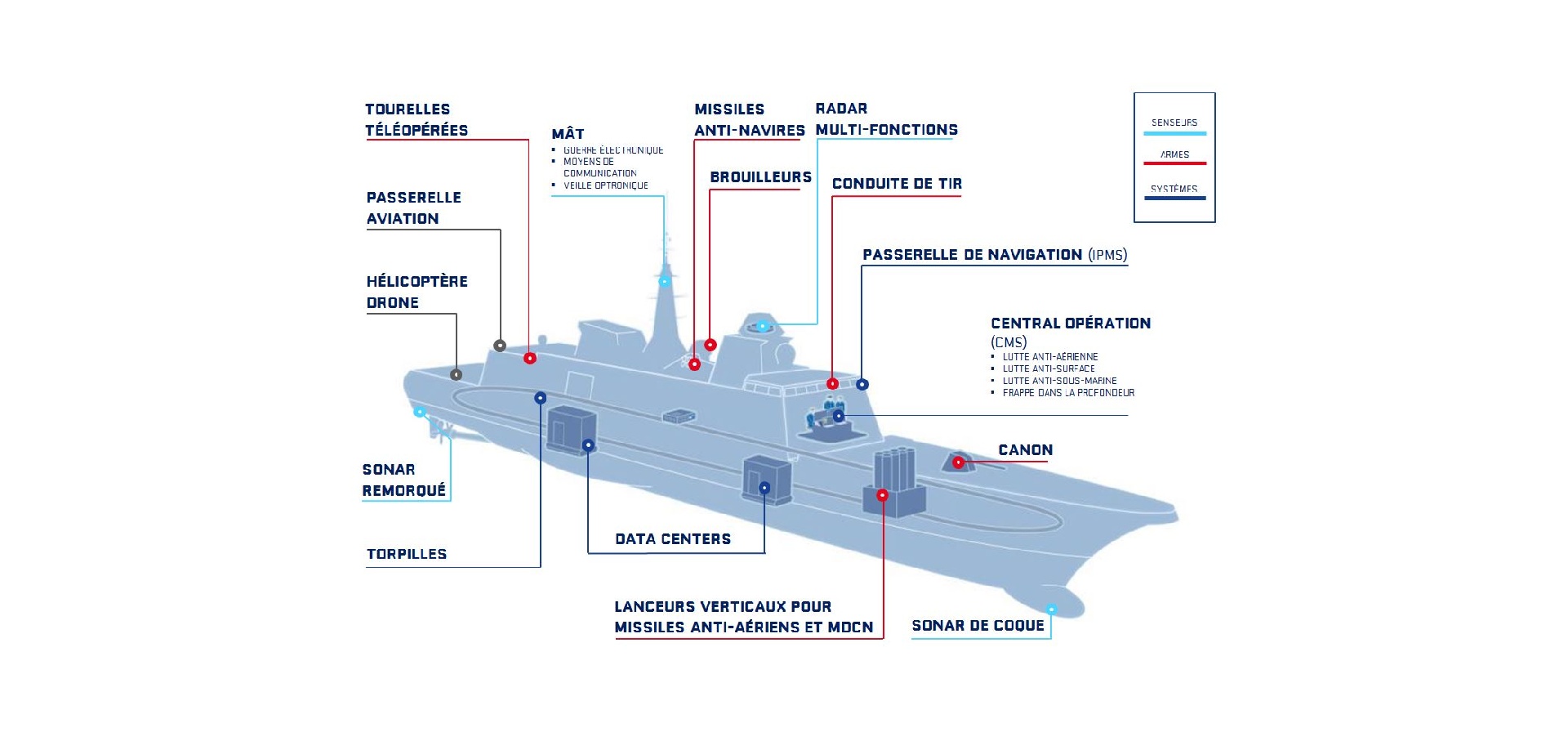 Les principaux équipements du navire de surface : tourelles téléopérées, passerelle aviation, hélicoptère drone, sonar remarqué, torpilles, mât, datacentres, missiles anti-navires, brouilleurs, lanceurs verticaux pour missiles anti-aériens et MDCN, radar multi-fonctios, conduite de tir, passerelle de navigation (IPMS), canon, sonar de coque, central opération (CMS).