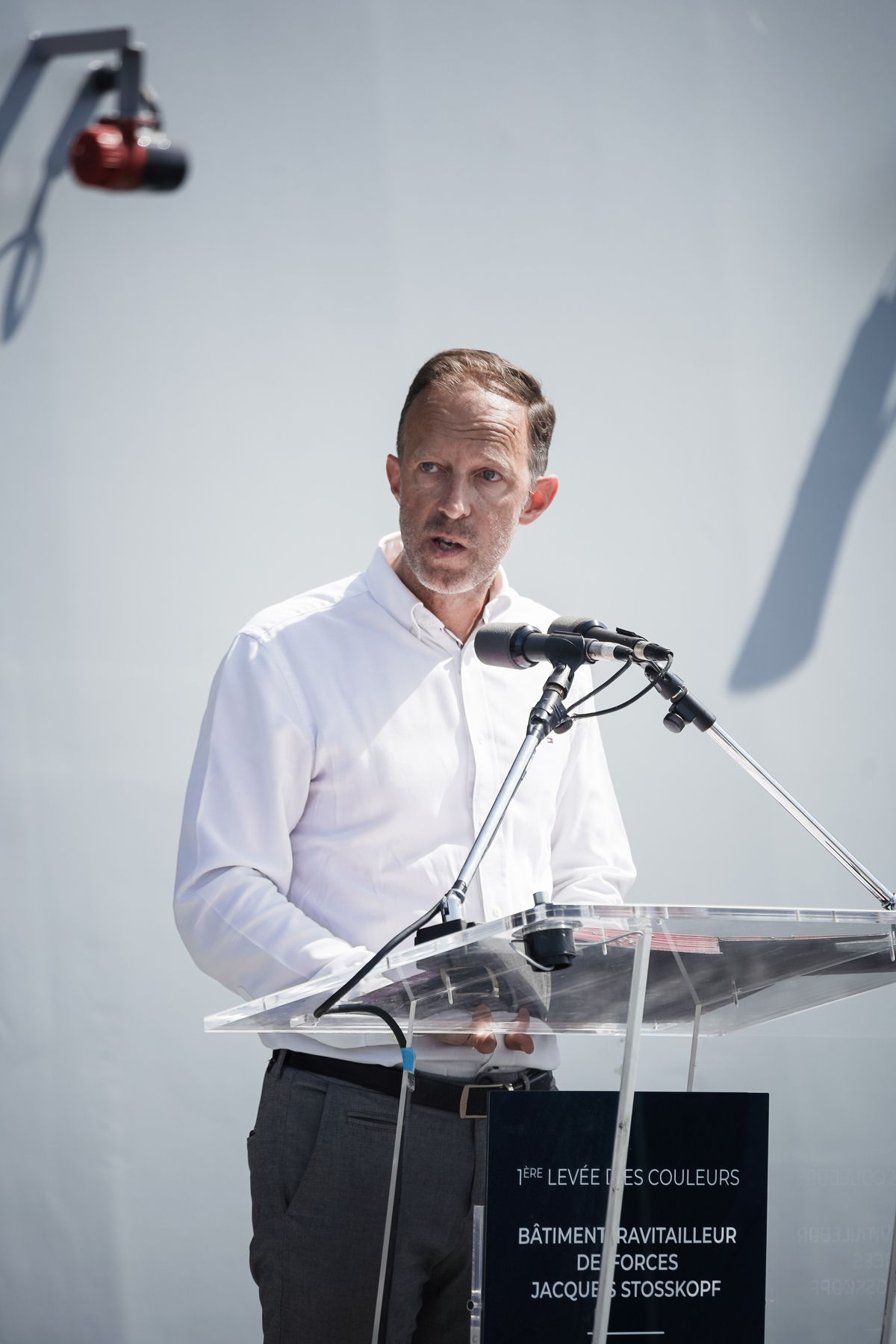 Sébastien Le Boulluec, Directeur des programmes militaires de Chantiers de l’Atlantique a déclaré lors de la cérémonie « C’est toujours avec émotion que les équipes impliquées dans la construction s’apprêtent à voir partir un navire des chantiers. D35 ou Jacques Stosskopf est le fruit de coopérations multiples : coopération à l’échelle européenne au travers du programme LSS ; synergie industrielle entre Naval Group et Chantiers de l’Atlantique, offrant les meilleures expertises des secteurs militaires et civils ; et aussi collaboration avec notre réseau de coréalisateurs et fournisseurs partenaires ».