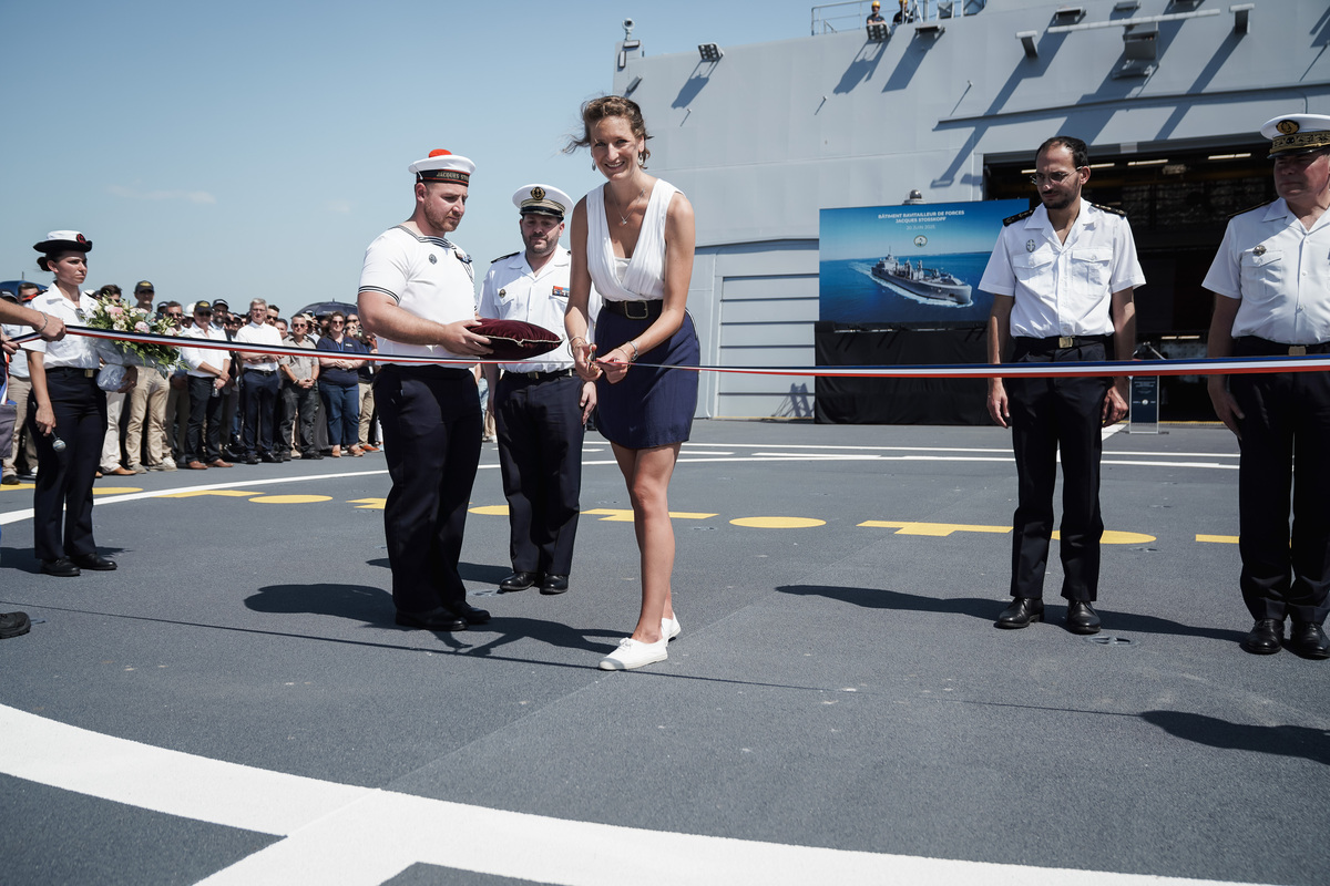 La cérémonie de première levée des couleurs à bord du bâtiment ravitailleur de forces (BRF) Jacques Stosskopf, qui fait officiellement du navire un bâtiment militaire français, a eu lieu aujourd’hui à Saint-Nazaire. A cette occasion, Claire Stosskopf, petite-fille de Jacques Stosskopf, a été investie du rôle de marraine du navire.